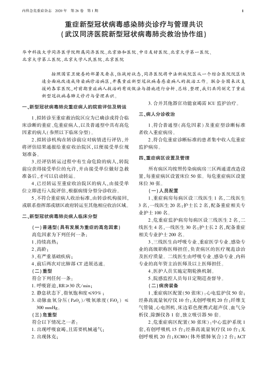 重症新型冠状病毒感染肺炎诊疗与管理共识